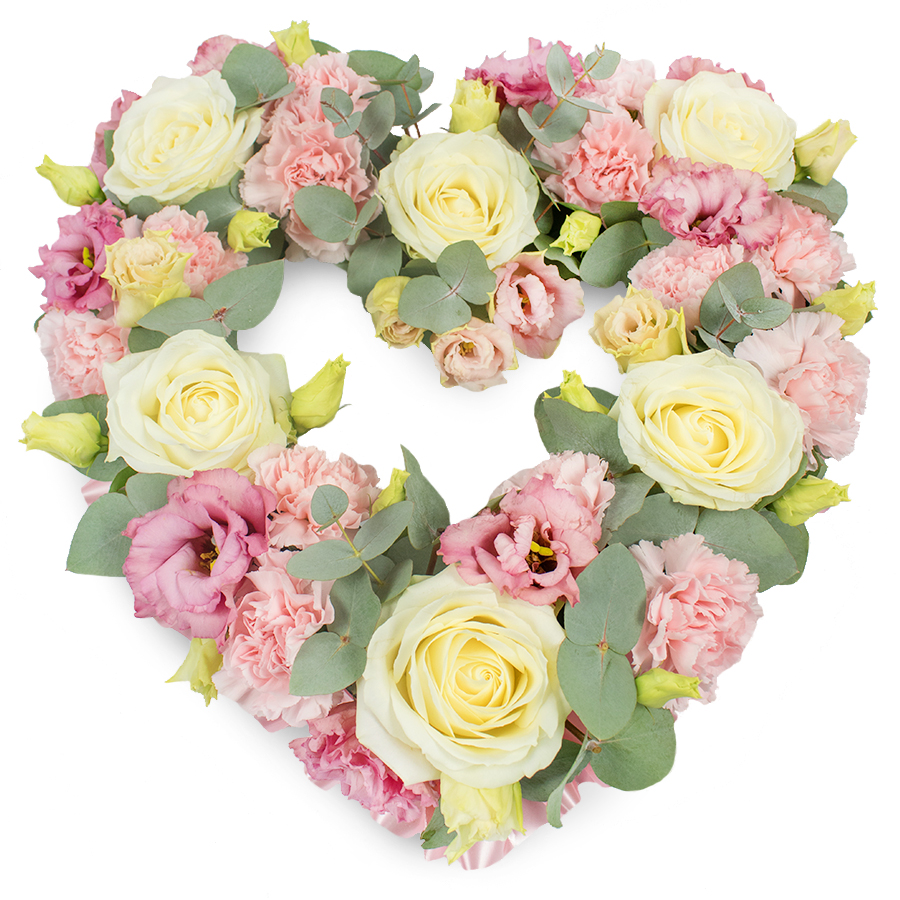 Express your heartfelt condolences with our Open Heart Tribute bouquet. Featuring a beautiful combination of white roses, pink carnations, pink lisianthus, and Eucalyptus leaves, this arrangement is both unique and elegant.